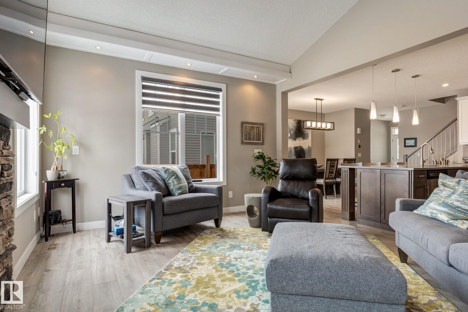 Welcome to this stylish two-storey home with fantastic curb appeal and an extra-wide, heated double garage. The bright, open-concept main floor features a modern kitchen with white uppers, dark lowers, subway tile backsplash, stainless appliances, and a large island with seating. The living room offers a stone-surround fireplace and big windows for natural light, while the dining area opens to the backyard. Upstairs, the primary bedroom includes a large ensuite with double sinks and a custom shower, plus access to an upper patio perfect for morning sun. High-quality window coverings and central A/C add comfort throughout. The unfinished basement offers future potential. The backyard is fully finished with a large tiled area, fire pit, 18×8 composite deck, 10×12 gazebo, 8×8 shed, and beautiful golf-course sunset views. Located in a desirable neighbourhood close to parks and amenities, this move-in-ready home is a must-see.